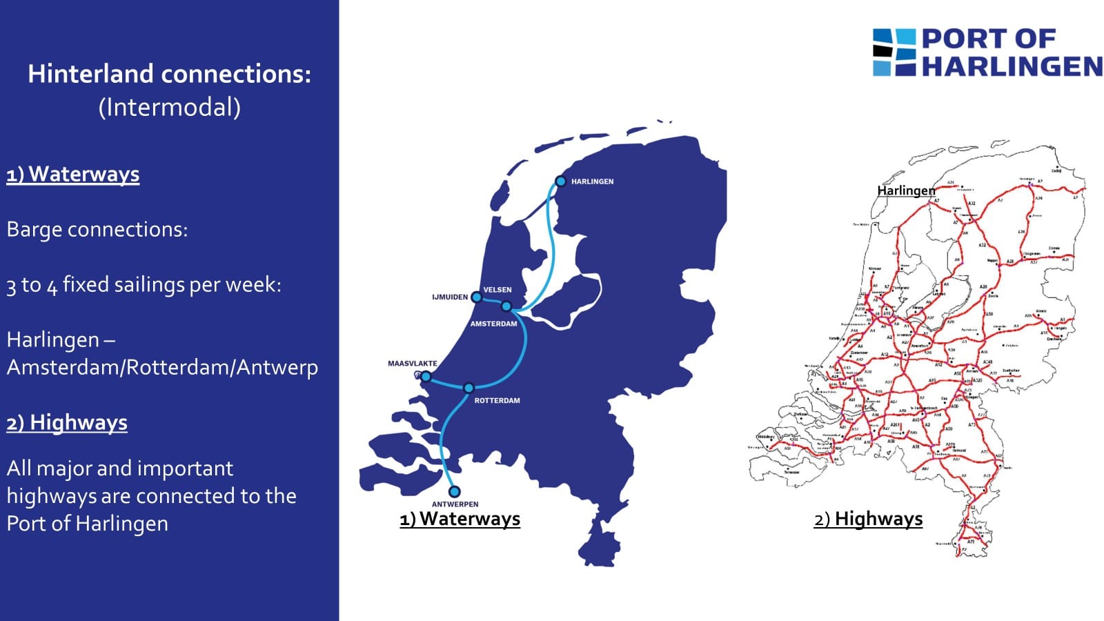 De haven van Harlingen is via de Tsjerk Hiddessluizen verbonden met het Van Harinxmakanaal en zo met de hoofdvaarweg Lemmer- Delfzijl. Vanuit Delfzijl is er een verbinding met het Noord-Duitse achterland. Het van Harinxmakanaal is een klasse IV vaarweg waar maximaal toegestane afmetingen voor schepen gelden van 80 x 10 x 2,75 meter. Met ontheffing kunnen ook grotere schepen passeren tot 90 x 10,5 x 3,20 meter.